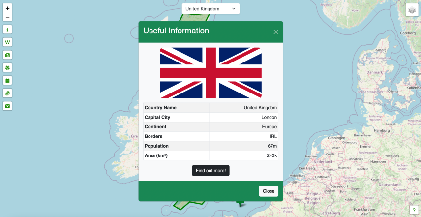 This project is an application that shows multiple countries' country information in pop-up modals. The application uses Leaflet.js to display a map of the world, and ajax requests with PHP and jQuery to populate the HTML with country information, a currency converter, country news, weather, and more. Markers are added to the map to show Wikipedia locations, cities, and recent earthquakes.